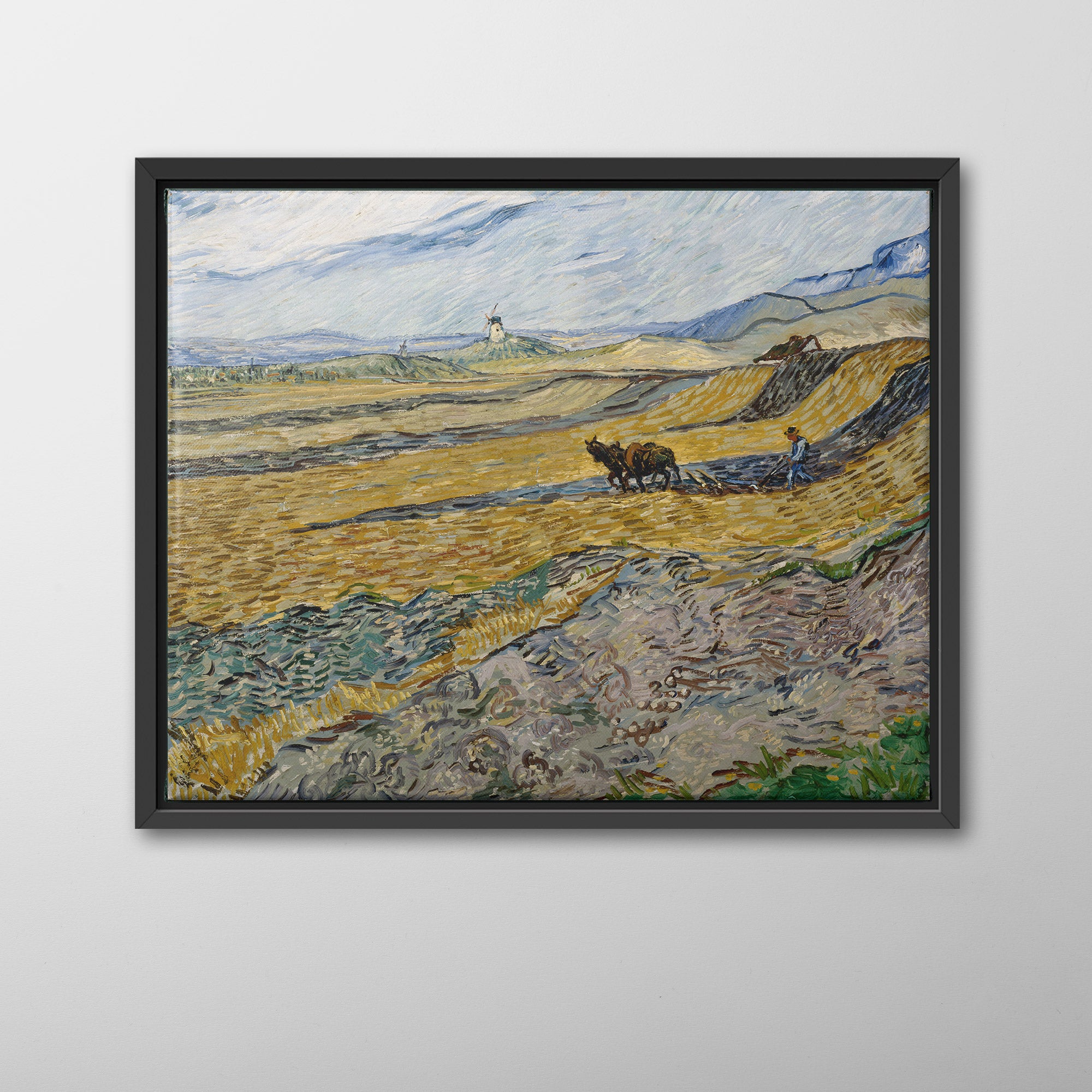 Enclosed Field with Plowman (1889) by Vincent van Gogh depicts a plowman tilling a wheat field surrounded by a low stone wall under a cloudy sky, and an old farm house behind a hill. It is one of a series of paintings of the view from his window at the asylum in Saint-Rémy. This version shows windmills in the far distance, an addition from the artist's imagination.