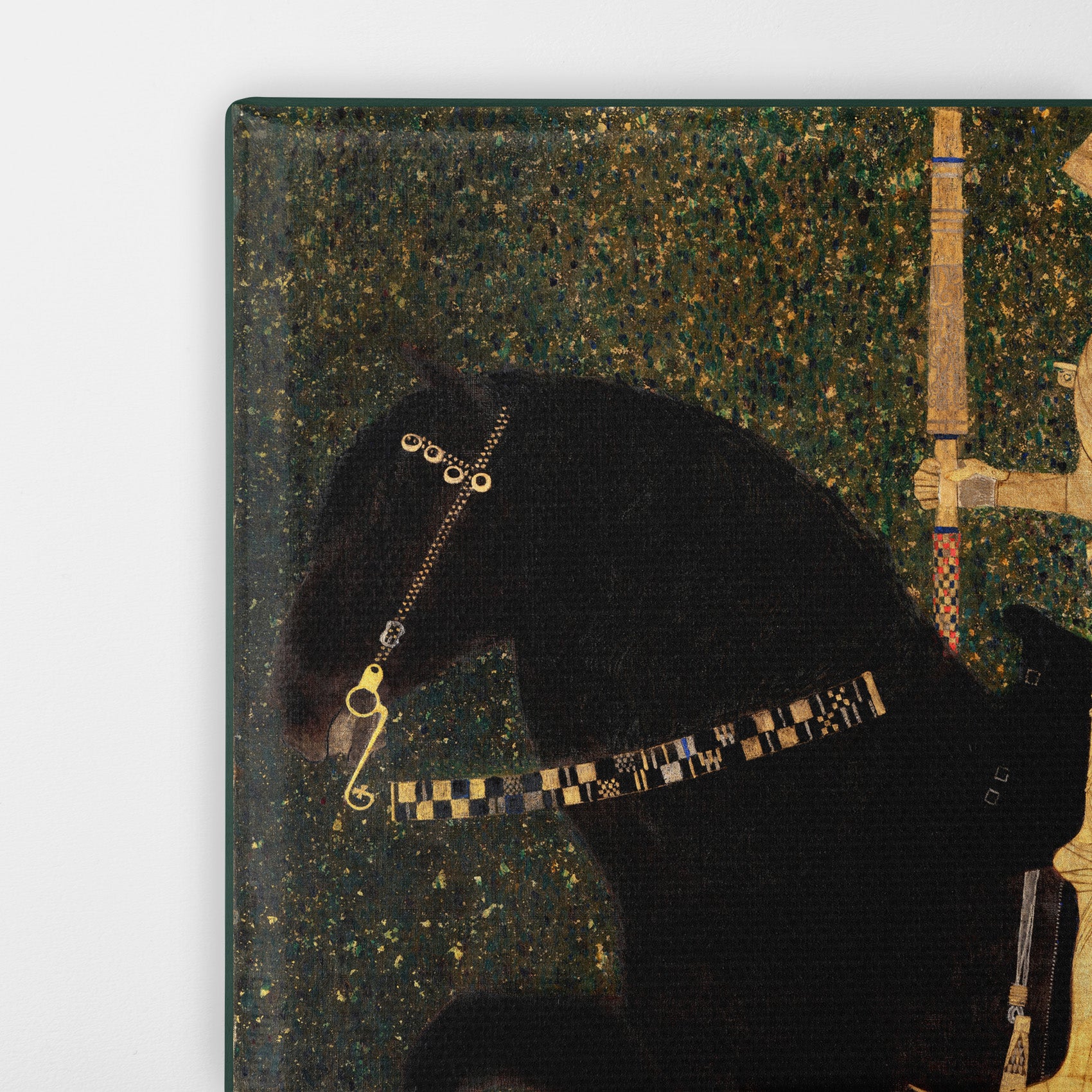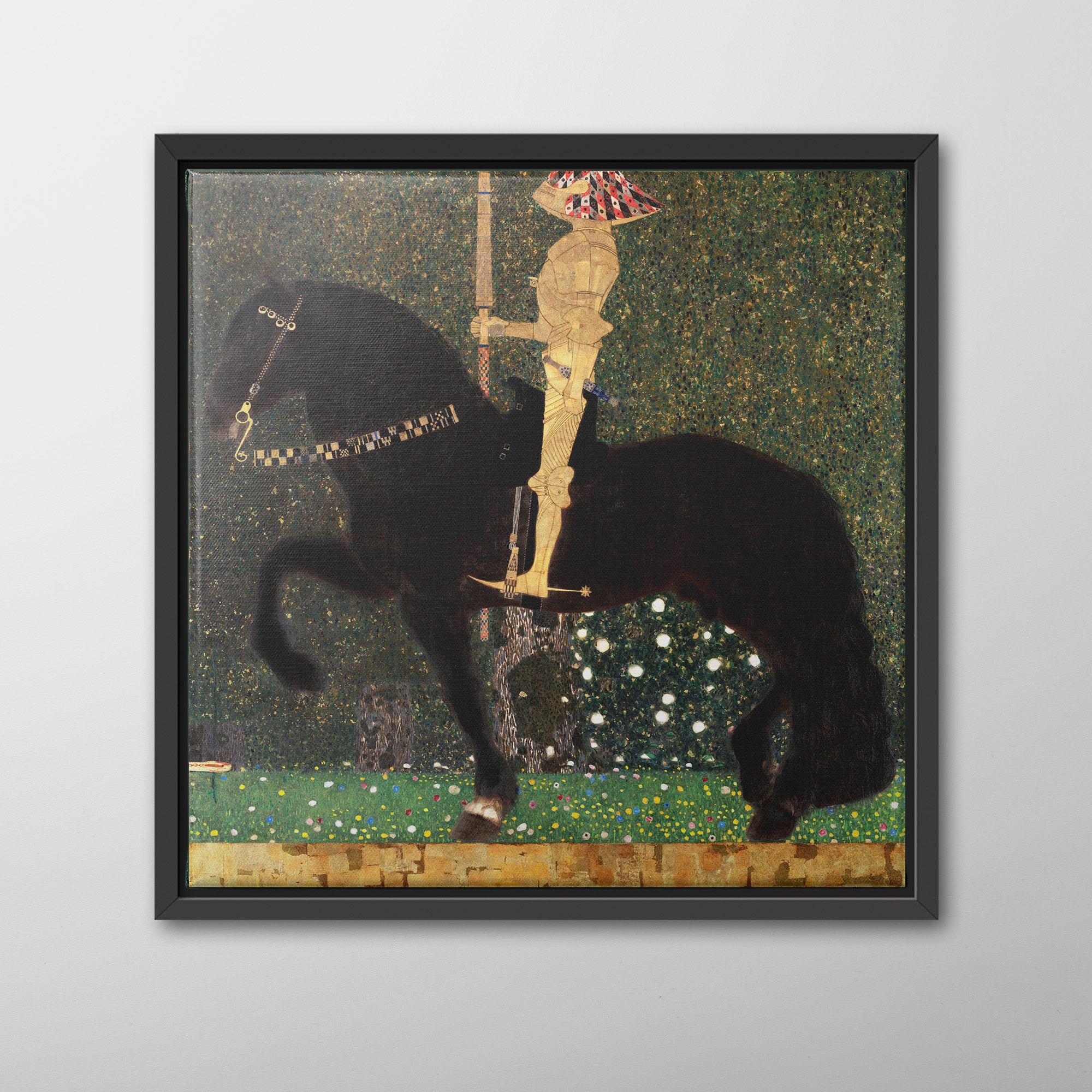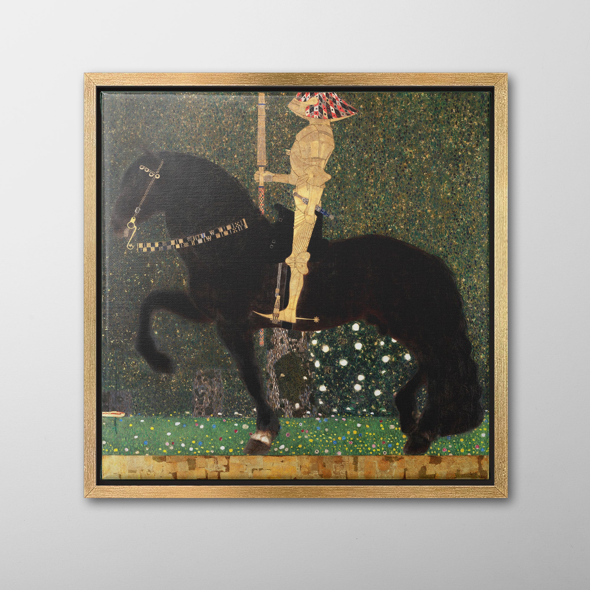 Life is a Struggle (1903) by Gustav Klimt, also known as The Golden Knight, depicts a knight in golden armor confronted by a snake. The knight and his horse are richly detailed, decorated in diamond and square patterns, against an intricate backdrop of a forest. The details were influenced by Byzantine mosaics that Klimt viewed in Ravenna, Italy, and the composition references Dürer's Knight, Death and the Devil (1513). The antagonist, a snake barely visible in the lower left, obstructs the knight's path.