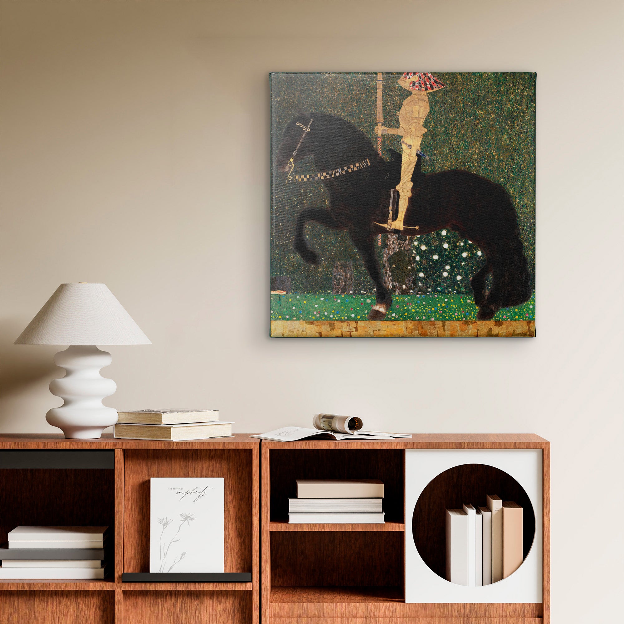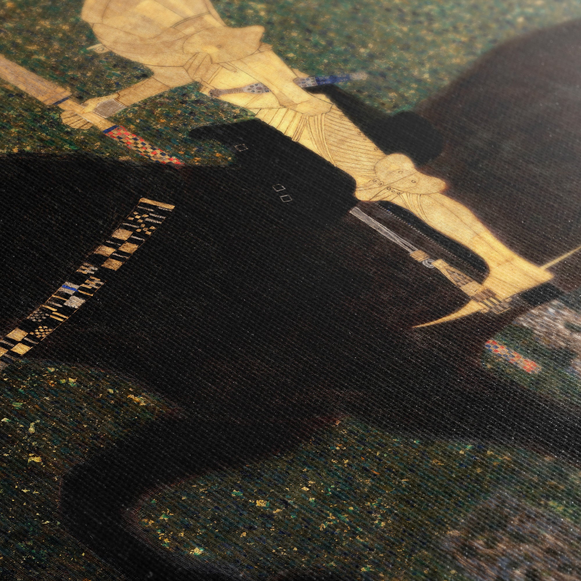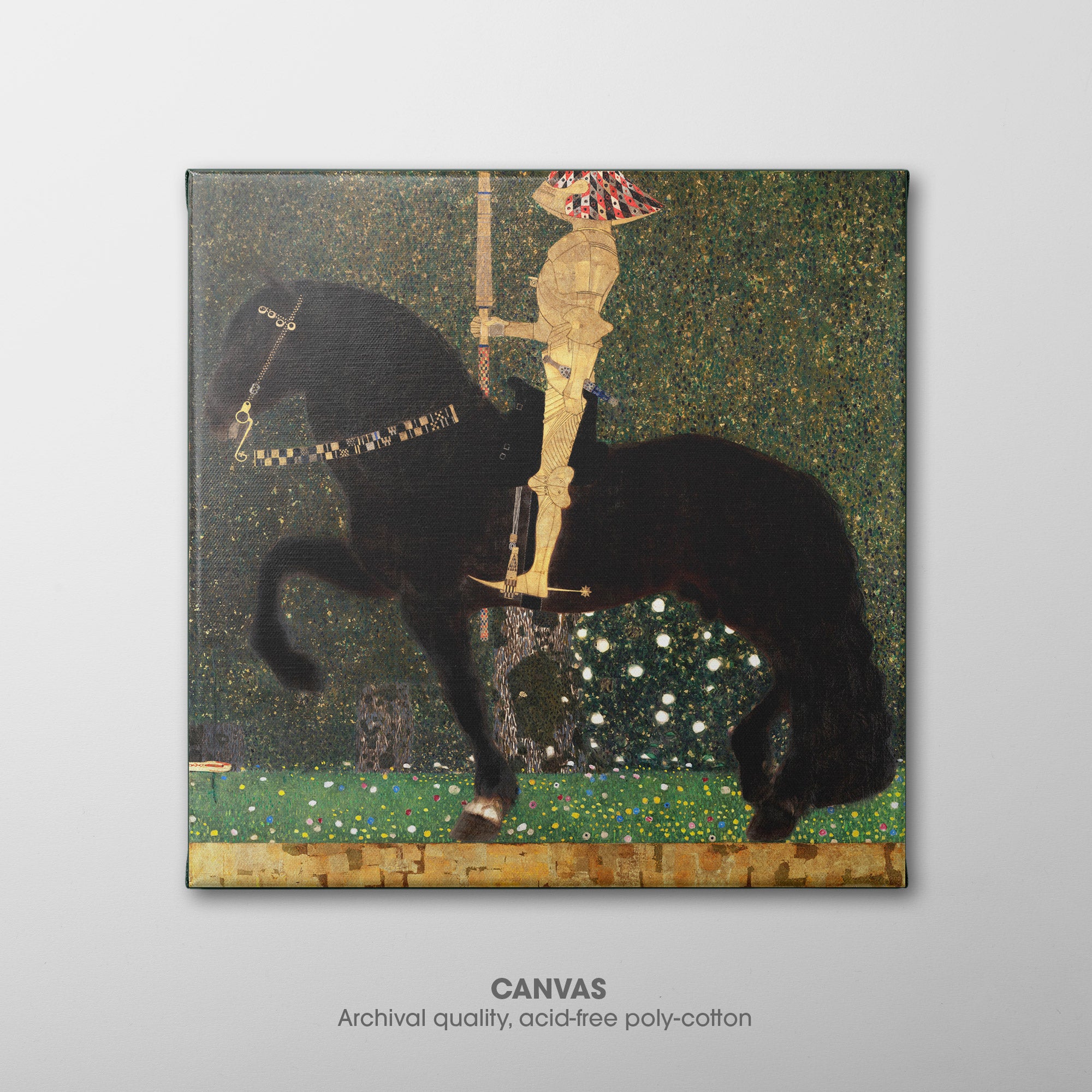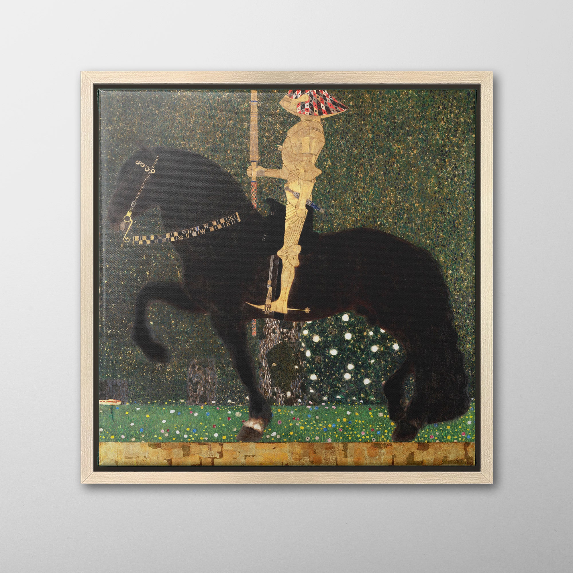 Life is a Struggle (1903) by Gustav Klimt, also known as The Golden Knight, depicts a knight in golden armor confronted by a snake. The knight and his horse are richly detailed, decorated in diamond and square patterns, against an intricate backdrop of a forest. The details were influenced by Byzantine mosaics that Klimt viewed in Ravenna, Italy, and the composition references Dürer's Knight, Death and the Devil (1513). The antagonist, a snake barely visible in the lower left, obstructs the knight's path.