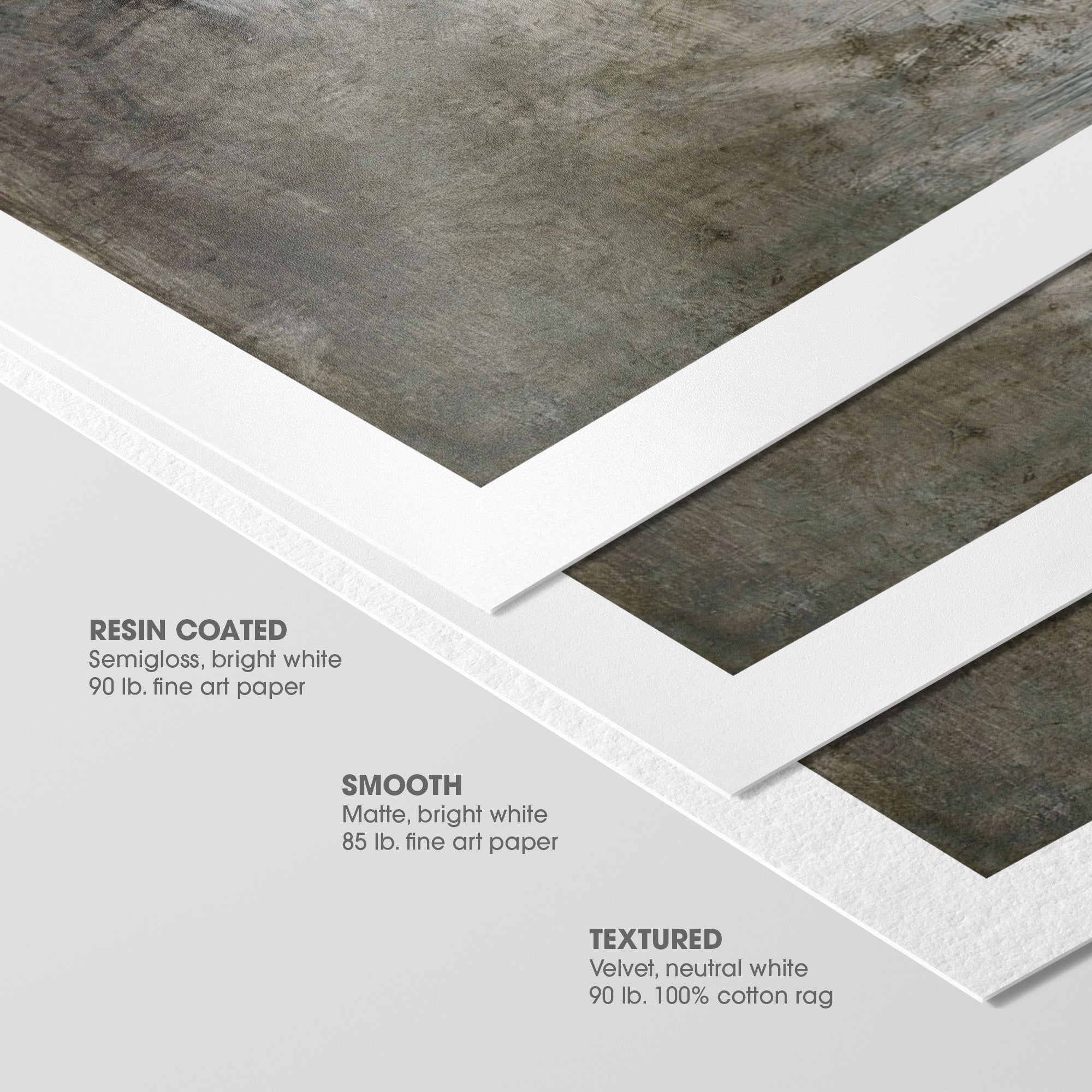 We offer modern frames intended to complement any art. No glass/glazing is used to showcase paper texture and avoid glare/reflectivity. Smooth paper maintains detail and color; textured paper slightly softens color with a traditional paper finish; and resin coated paper slightly deepens color adding a semi-gloss finish.