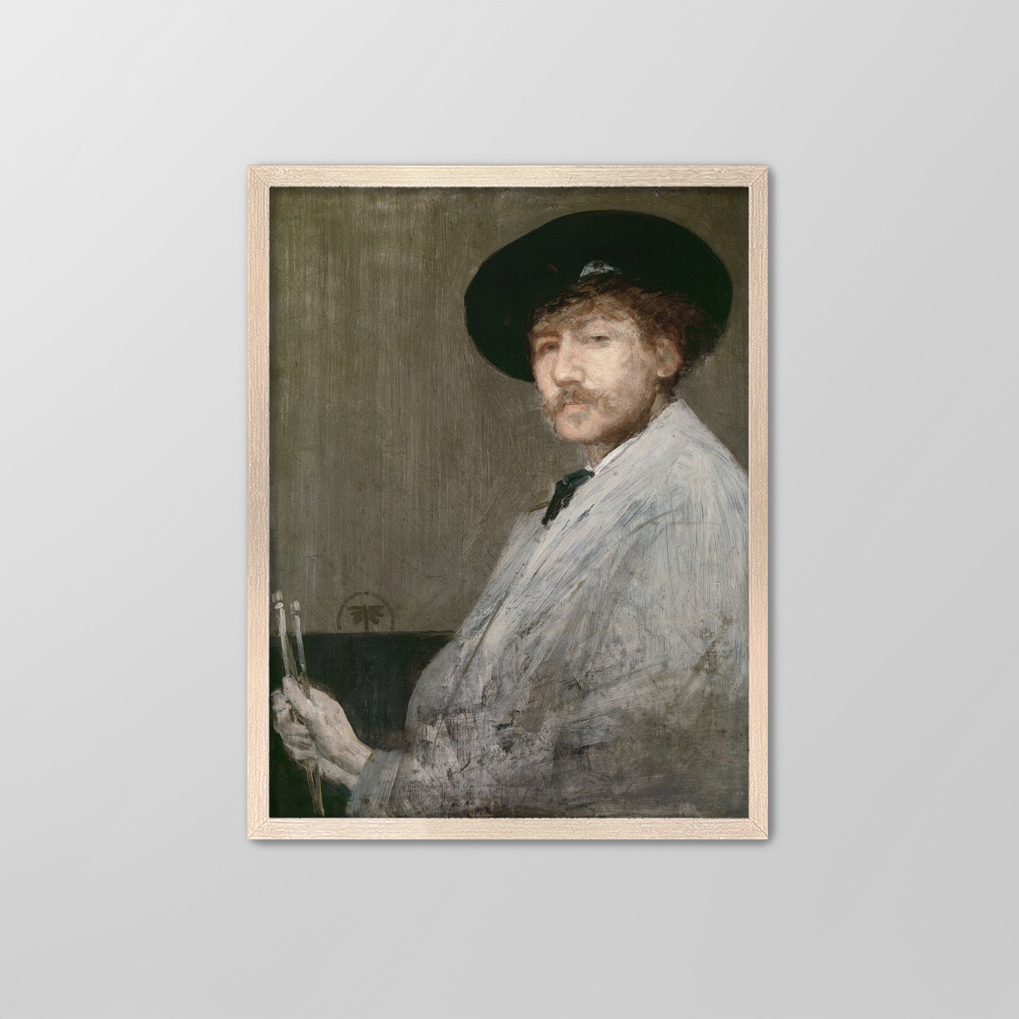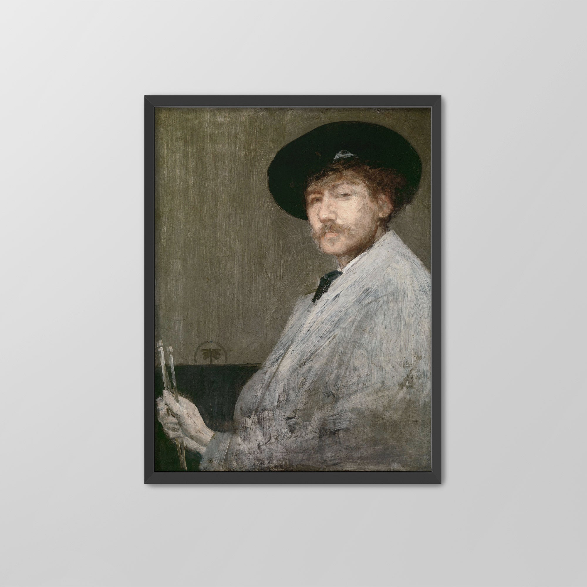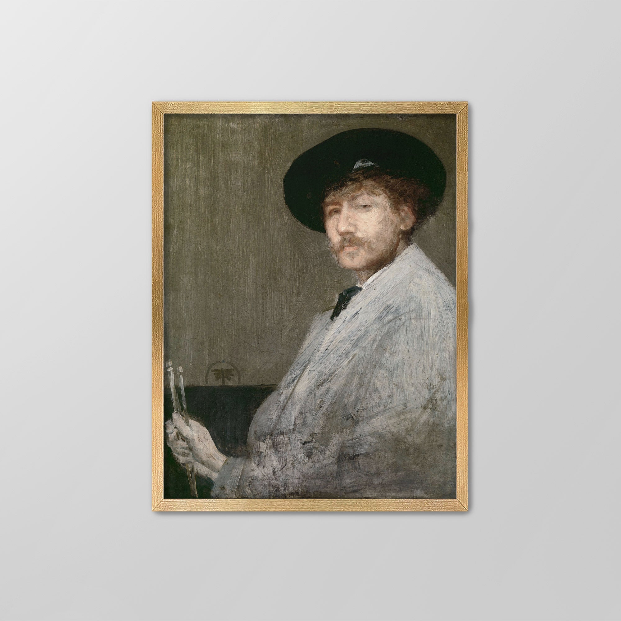 Arrangement in Gray, Portrait of the Painter (1872) by James McNeill Whistler depicts the artist in his painters smock holding brushes. His signature butterfly is prominently featured, first developed in the 1860s out of his interest in Asian art. The stylized butterfly with an added stinger for a tail combined both sides of his personality: his art is marked by a subtle delicacy, while his public persona was combative. Whistler once said, "It takes a long time for a man to look like his portrait."