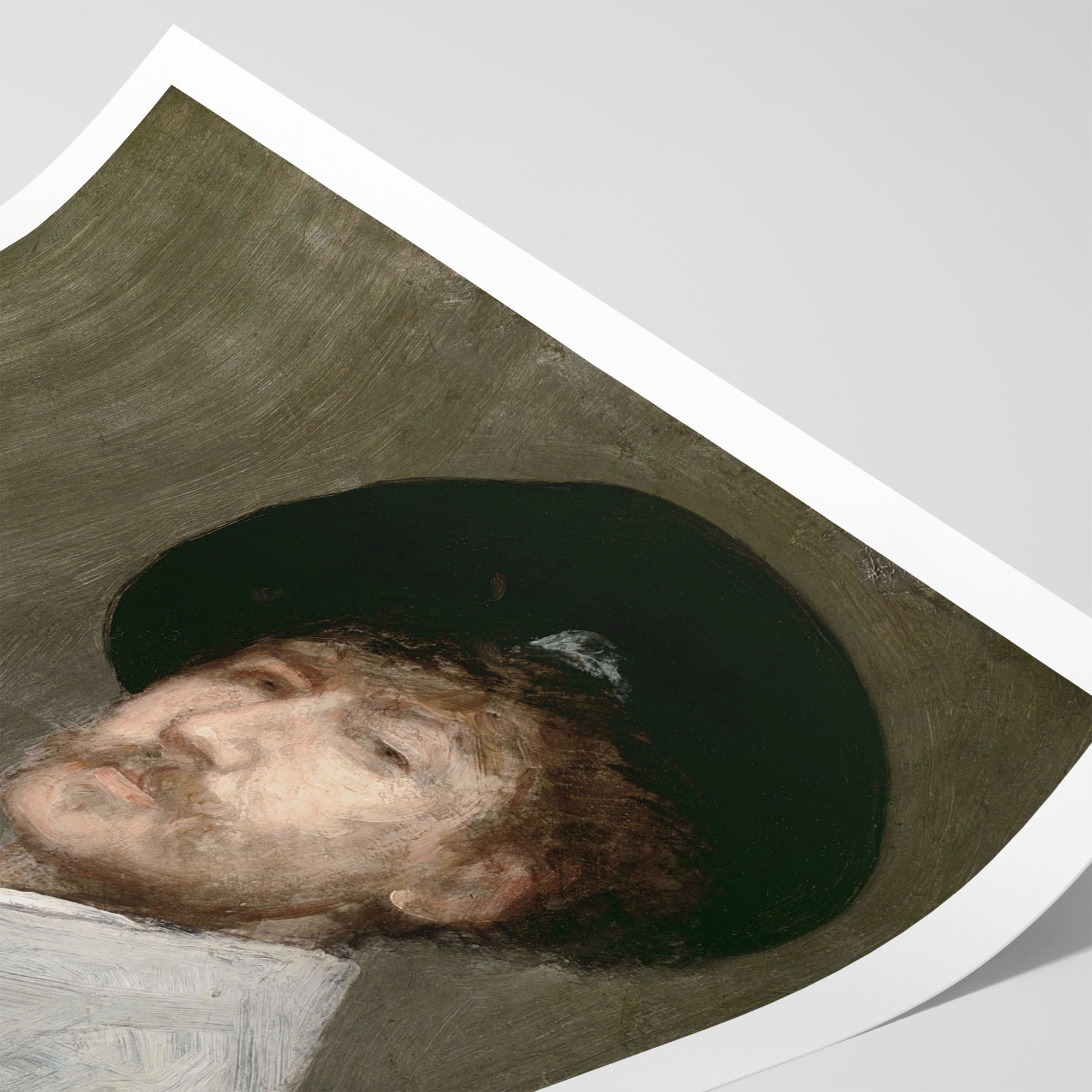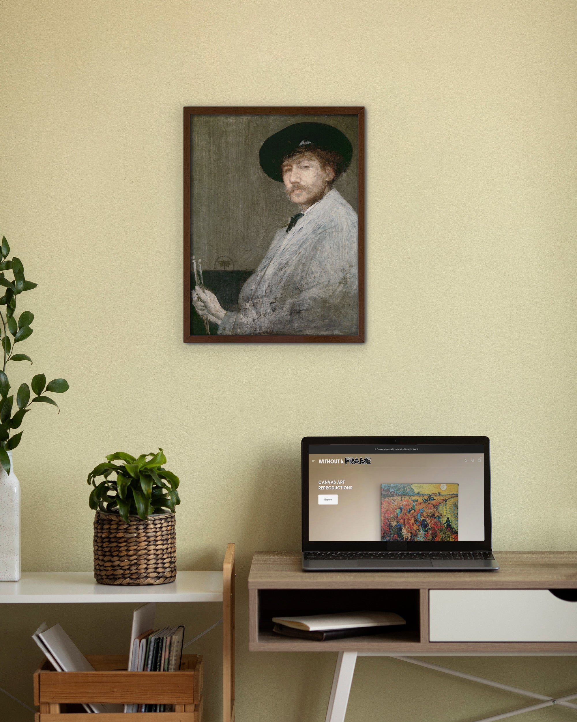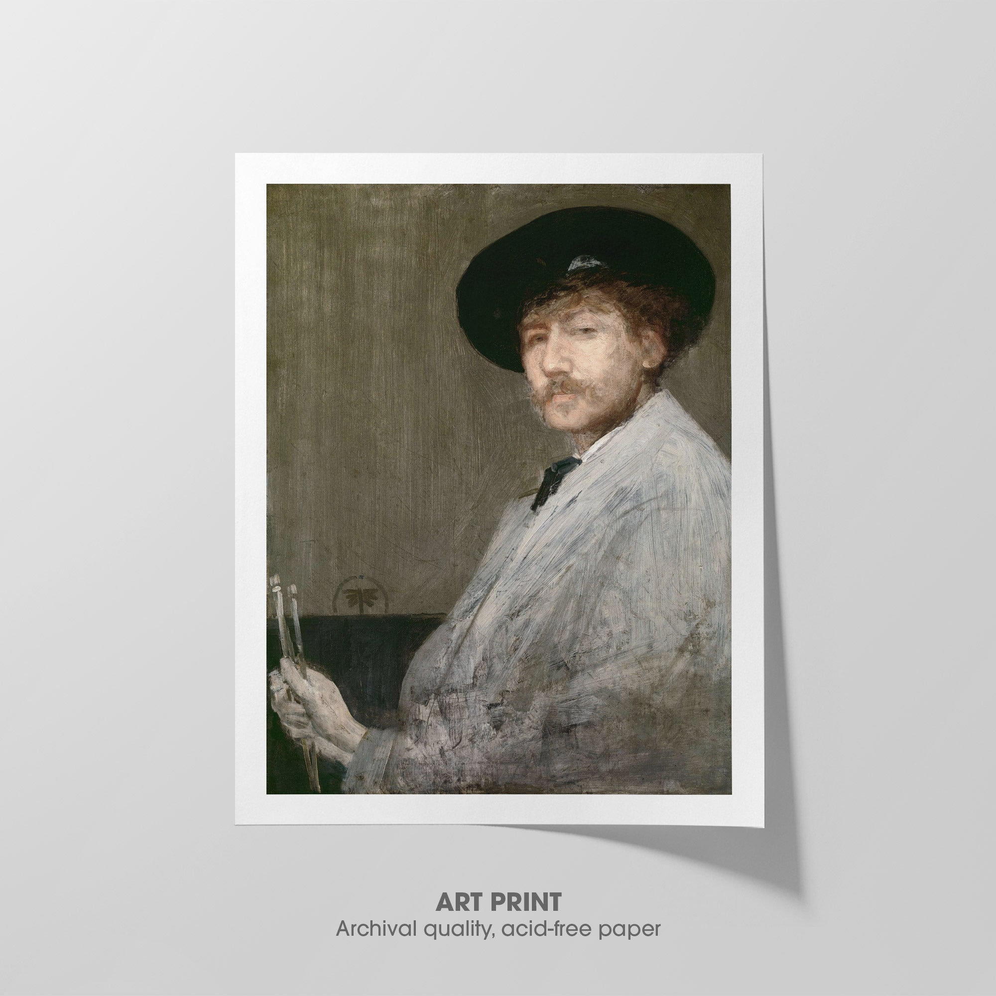 Arrangement in Gray, Portrait of the Painter (1872) by James McNeill Whistler depicts the artist in his painters smock holding brushes. His signature butterfly is prominently featured, first developed in the 1860s out of his interest in Asian art. The stylized butterfly with an added stinger for a tail combined both sides of his personality: his art is marked by a subtle delicacy, while his public persona was combative. Whistler once said, "It takes a long time for a man to look like his portrait."