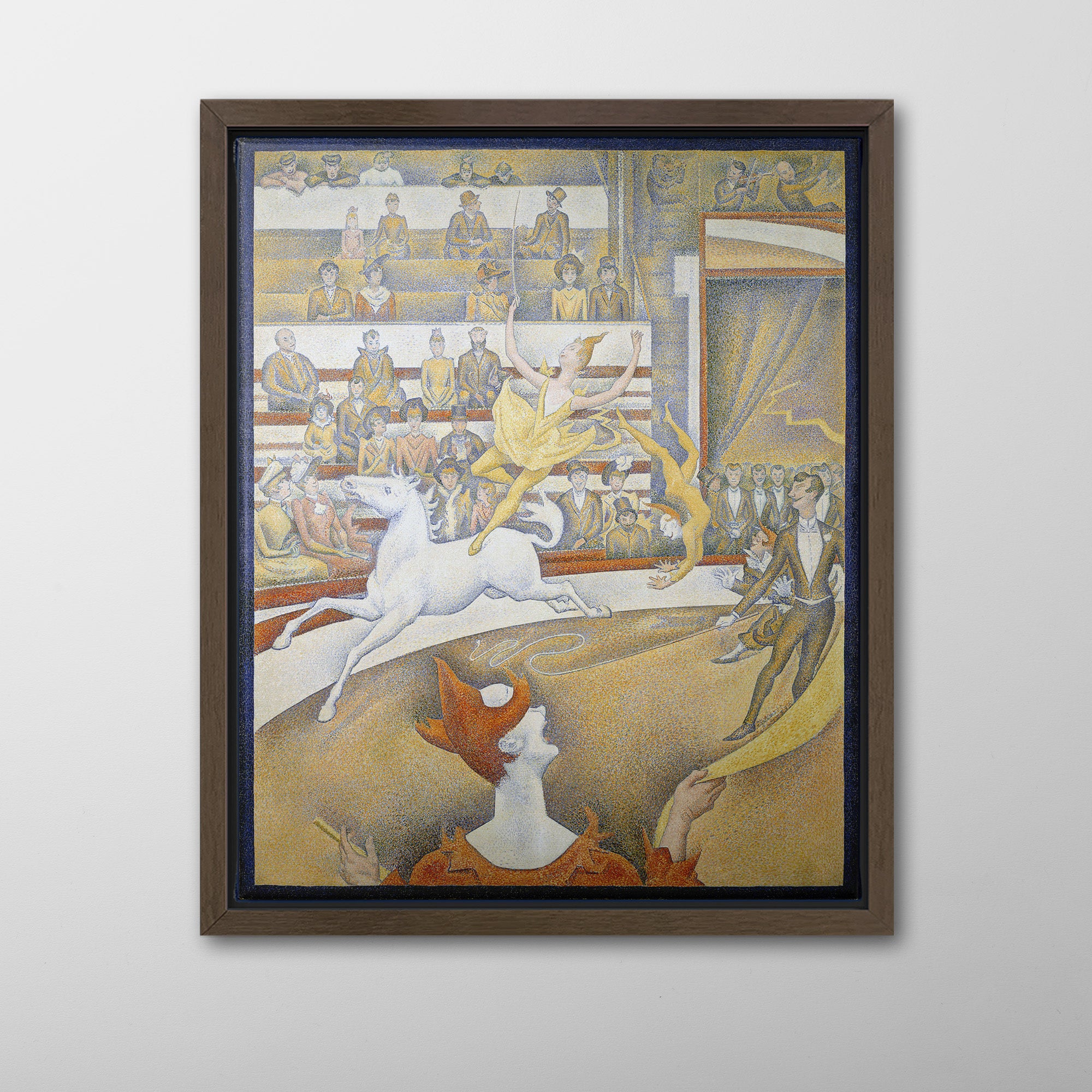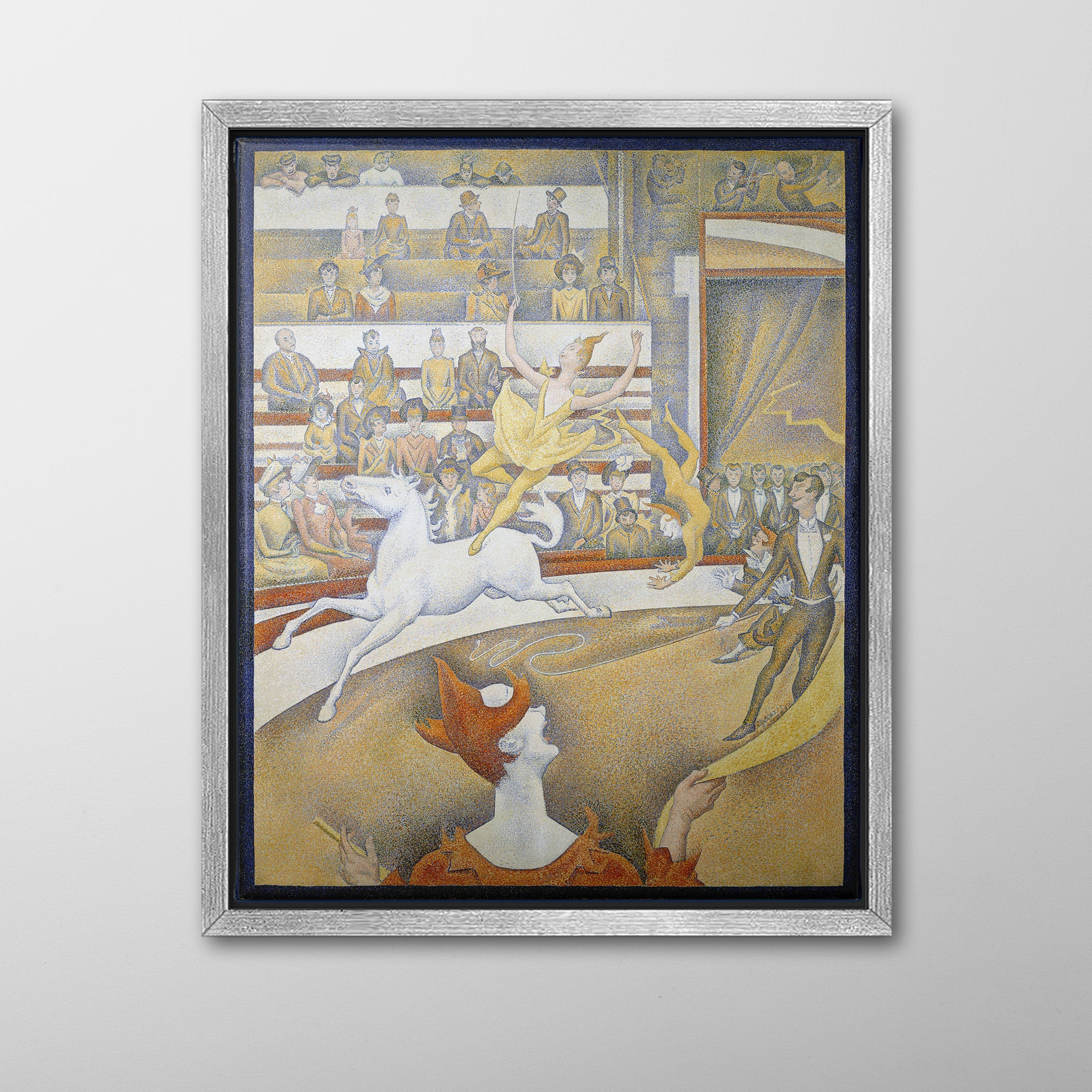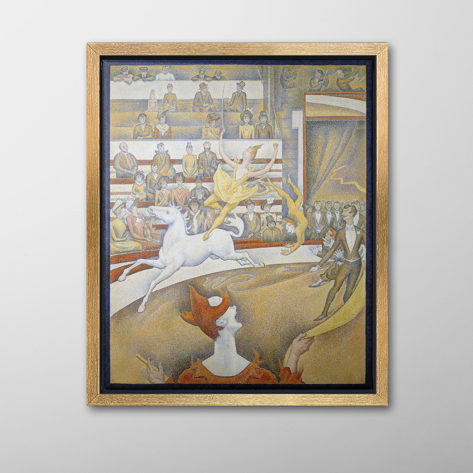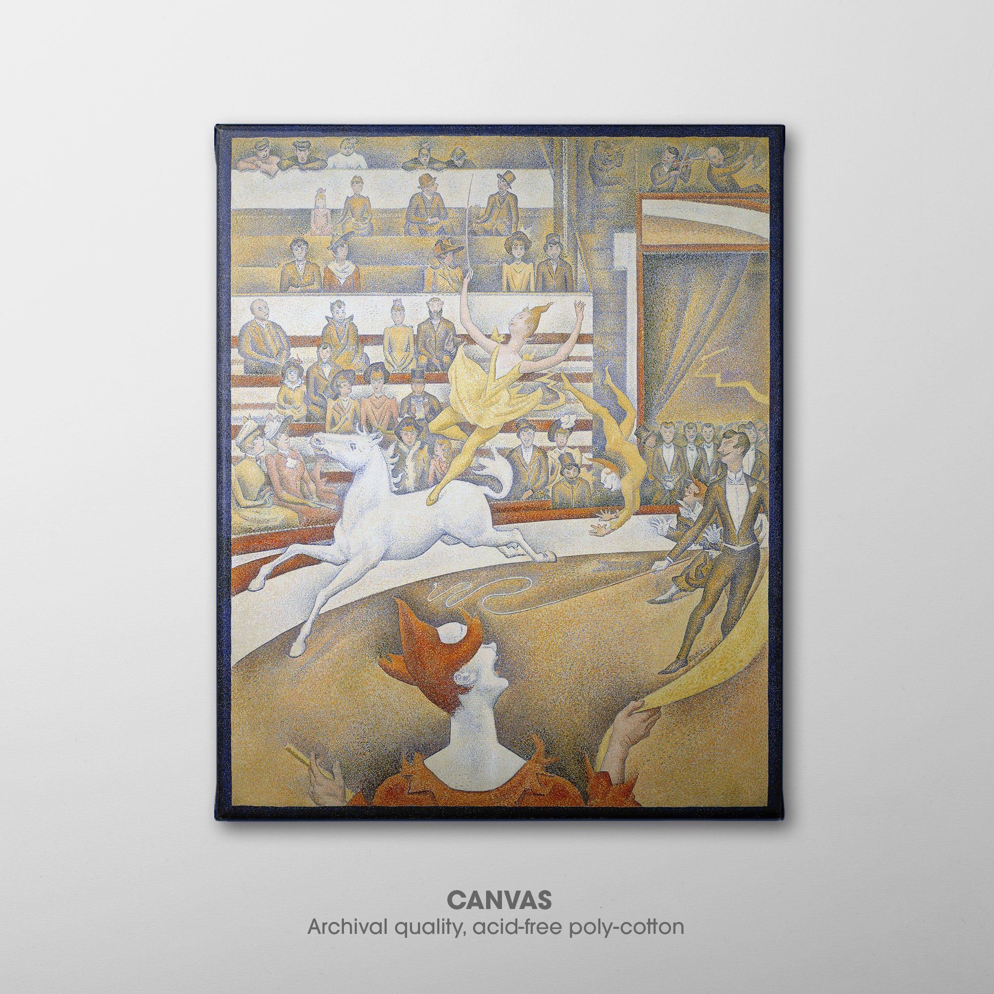 The Circus (1891, Le Cirque) by Georges Seurat is his third major work on the theme of the circus, and his last painting, unfinished at his death in March 1891 at age 31. It depicts a female acrobat performing on a horse at the Circus Fernando, along with other performers including the ringmaster and a clown, entertaining the audience in the bleachers, from the well-dressed higher classes near the front to the lower classes in the gallery at the back.