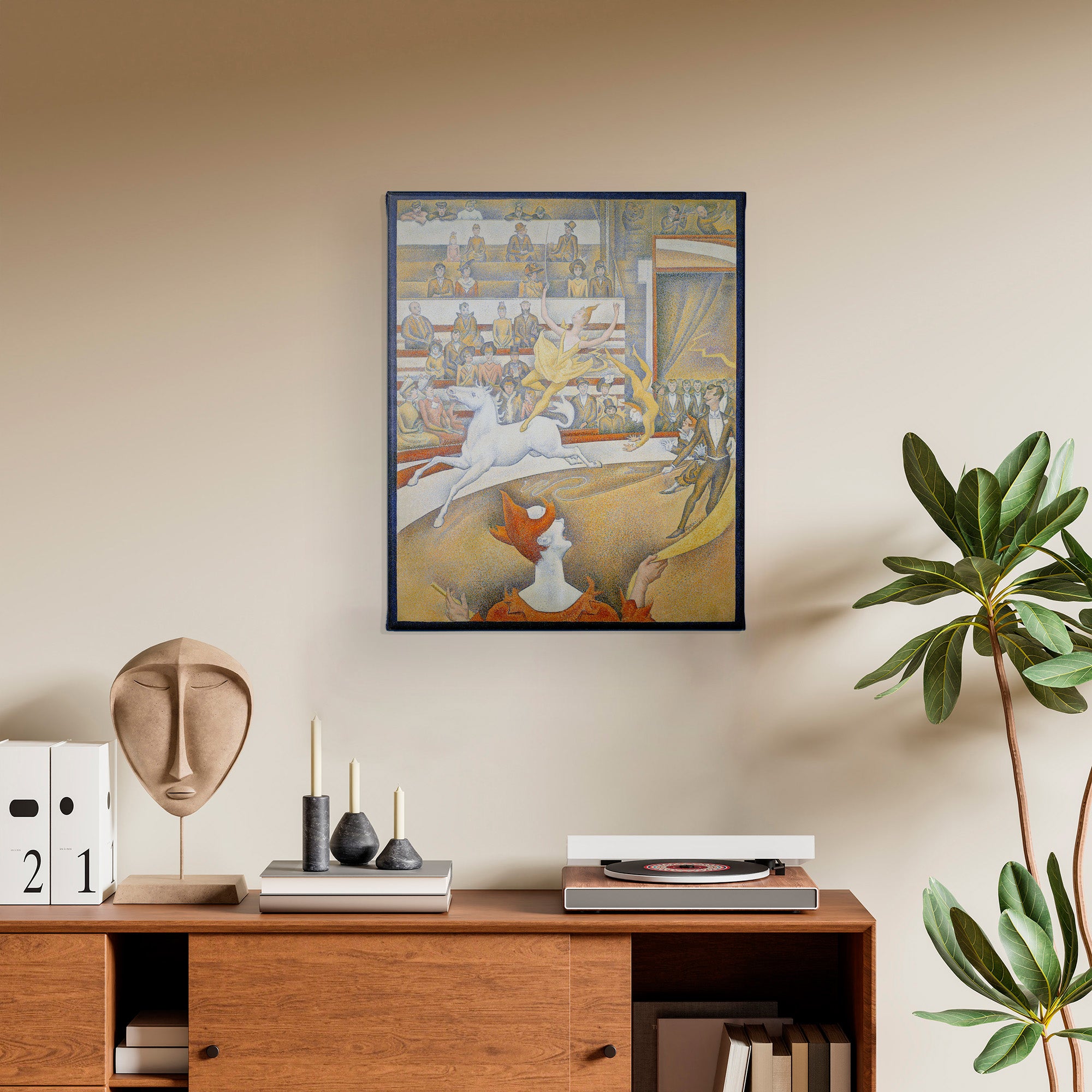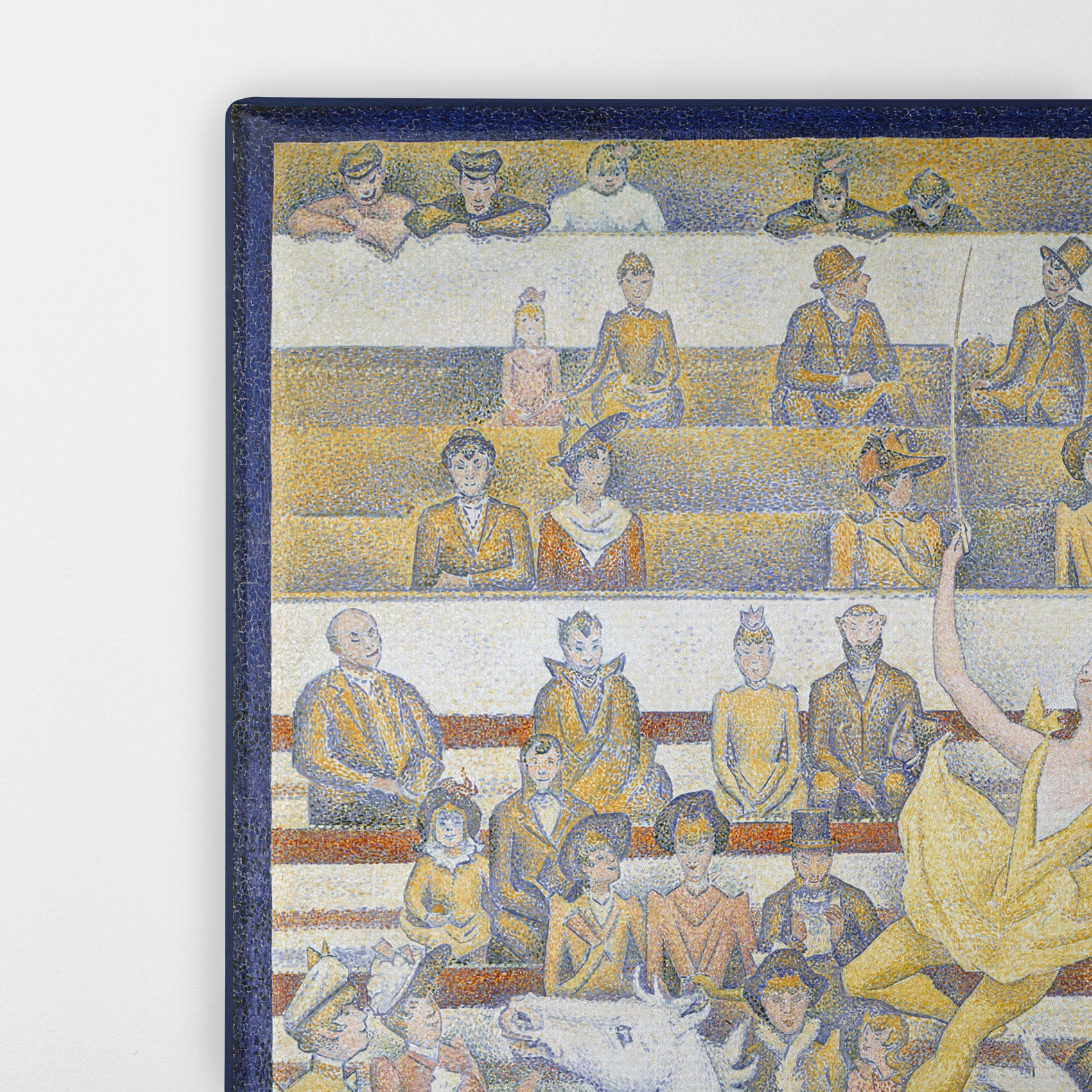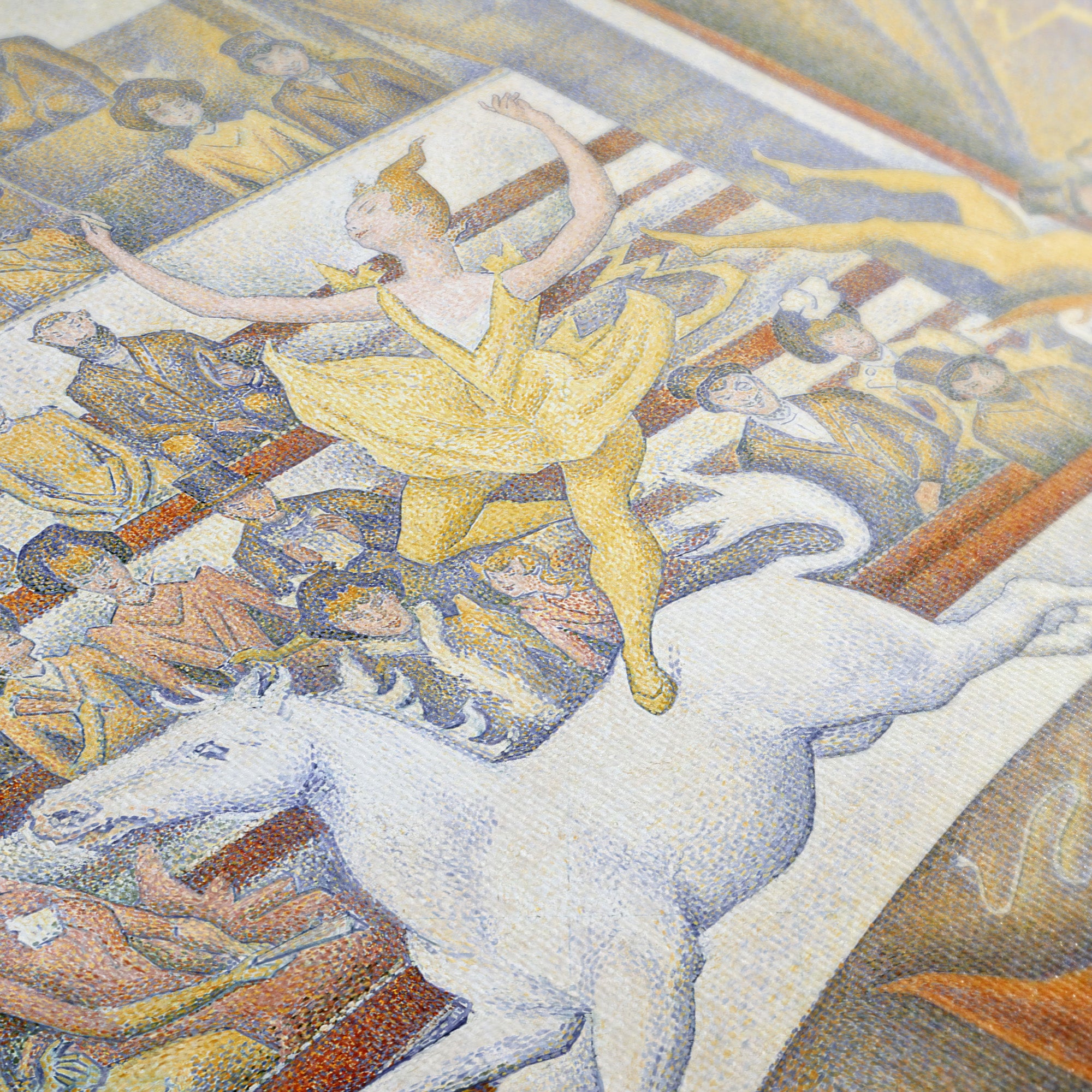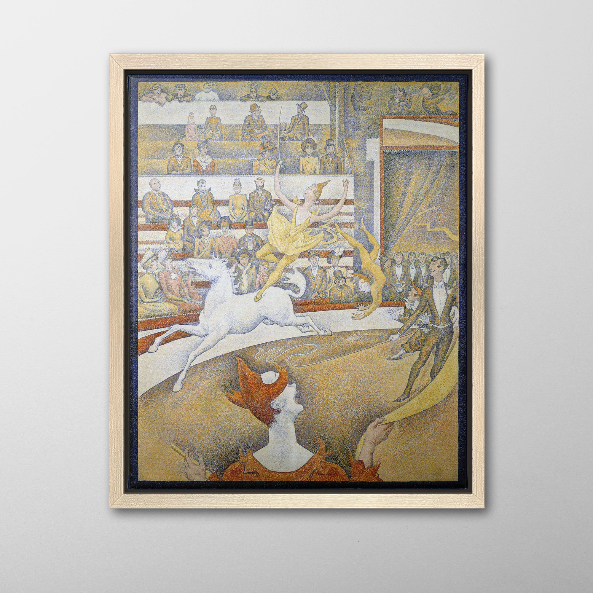 The Circus (1891, Le Cirque) by Georges Seurat is his third major work on the theme of the circus, and his last painting, unfinished at his death in March 1891 at age 31. It depicts a female acrobat performing on a horse at the Circus Fernando, along with other performers including the ringmaster and a clown, entertaining the audience in the bleachers, from the well-dressed higher classes near the front to the lower classes in the gallery at the back.